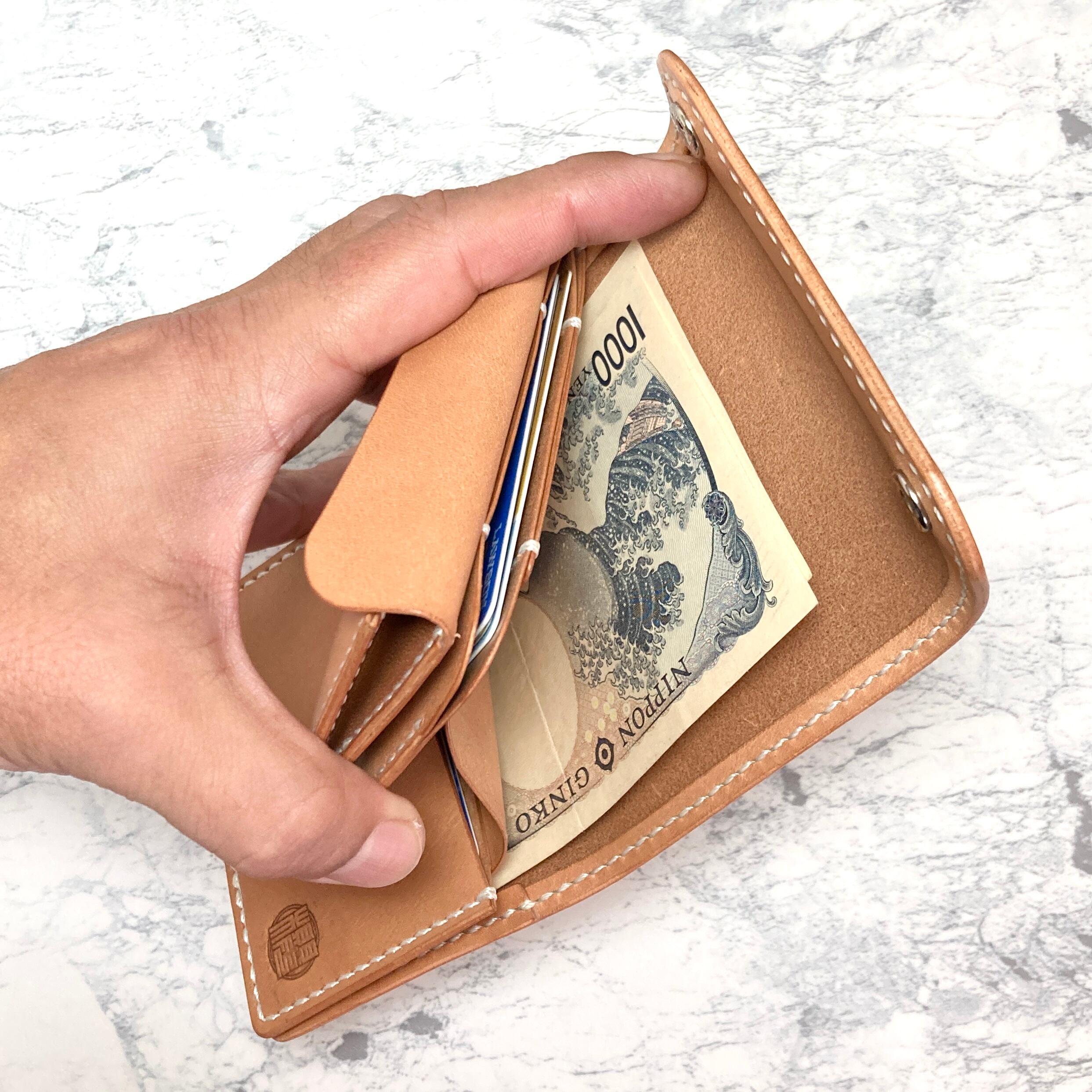 財布を開いたとき、必要なカードや現金が上方向に見えるレイアウトで、視認性と出し入れのしやすさを両立。無駄を削ぎ落とした、実用的な構造のコンパクト財布です。