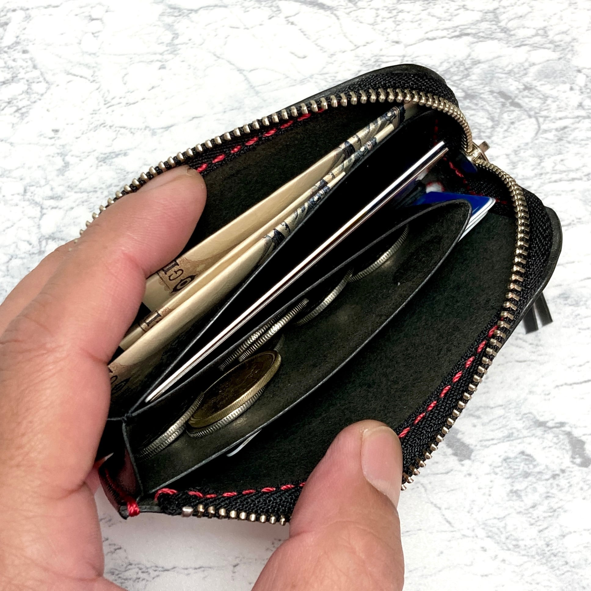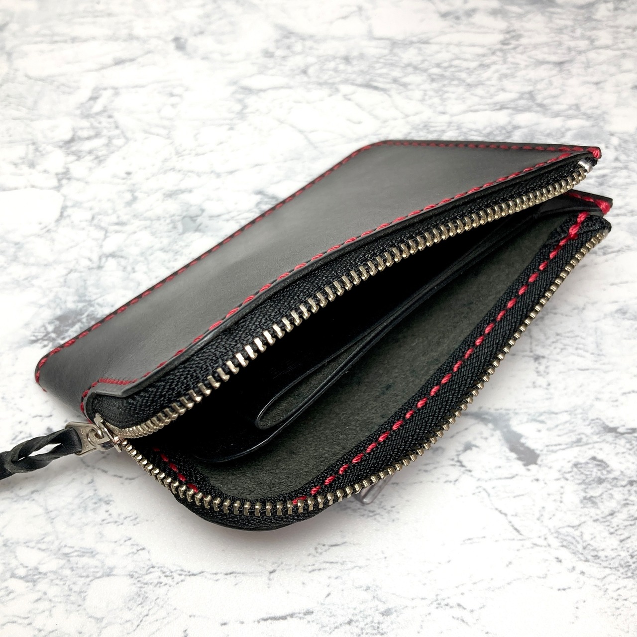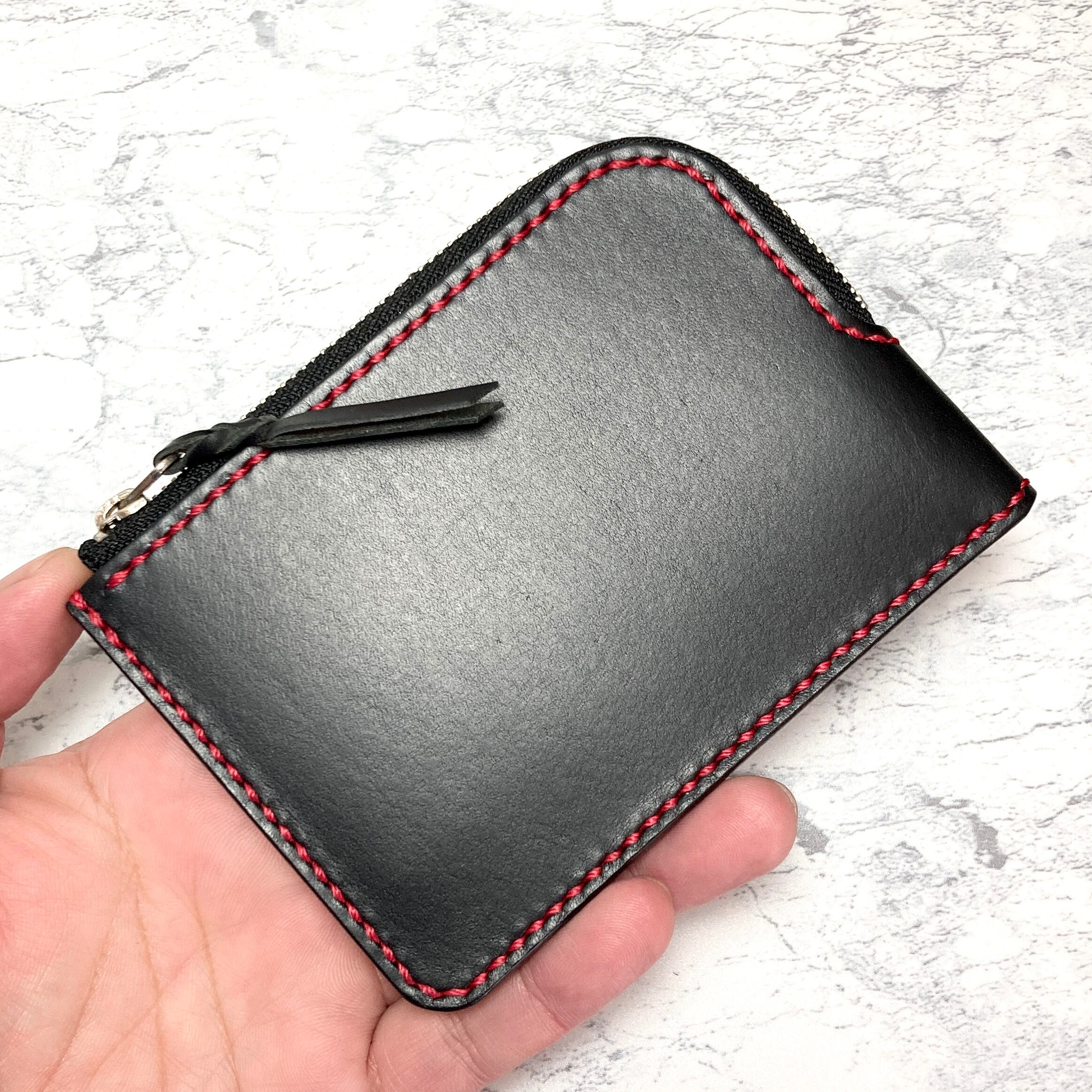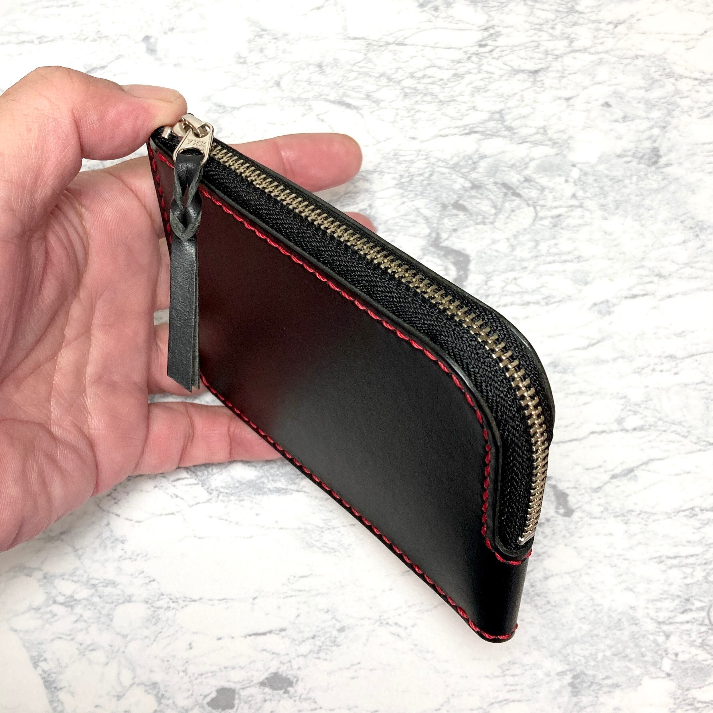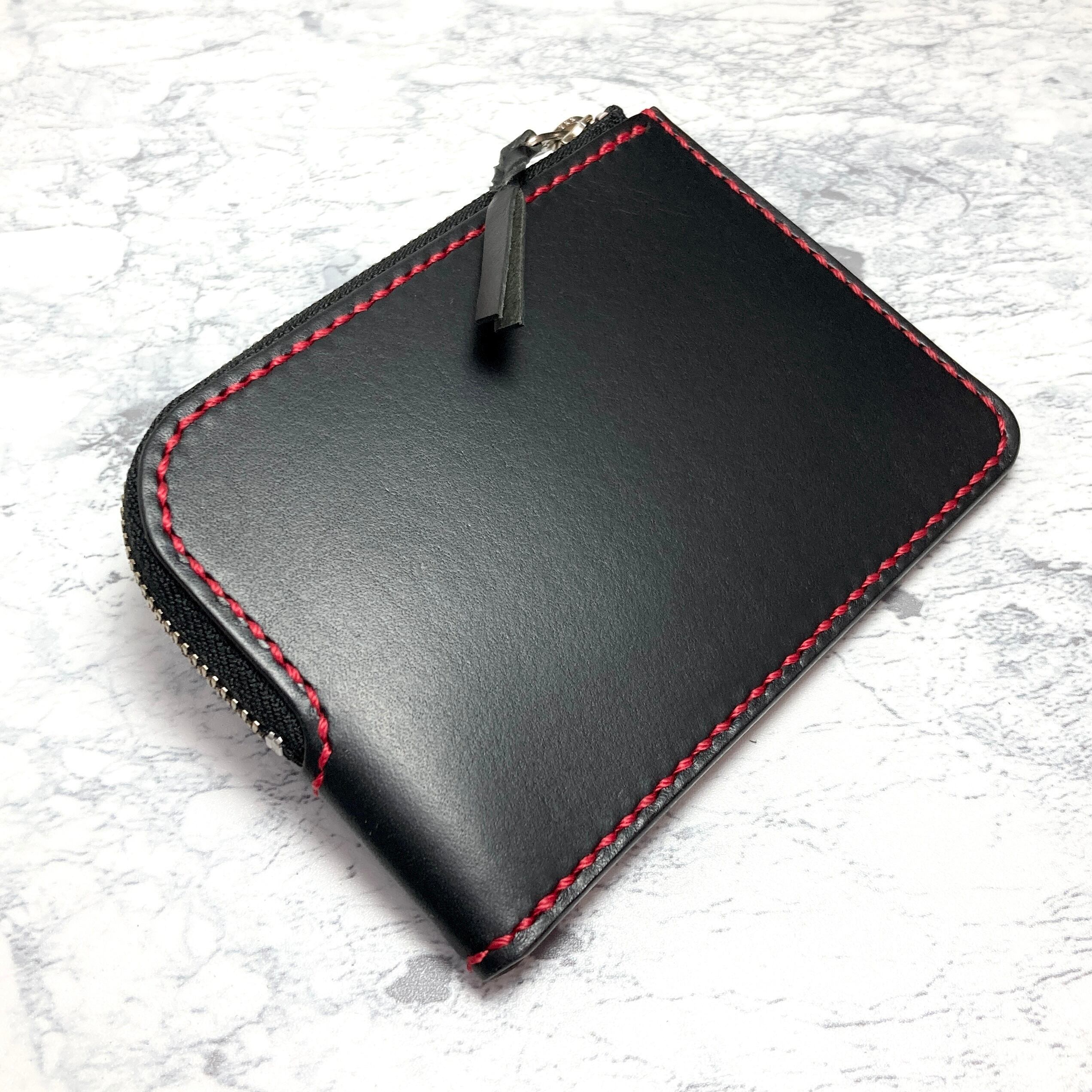 イタリア・Lo Stivale社のショルダー革で仕立てたL字ファスナー財布。深みのあるブラックに、赤のステッチを走らせることで、シンプルな中にもモダンな表情を引き出しました。