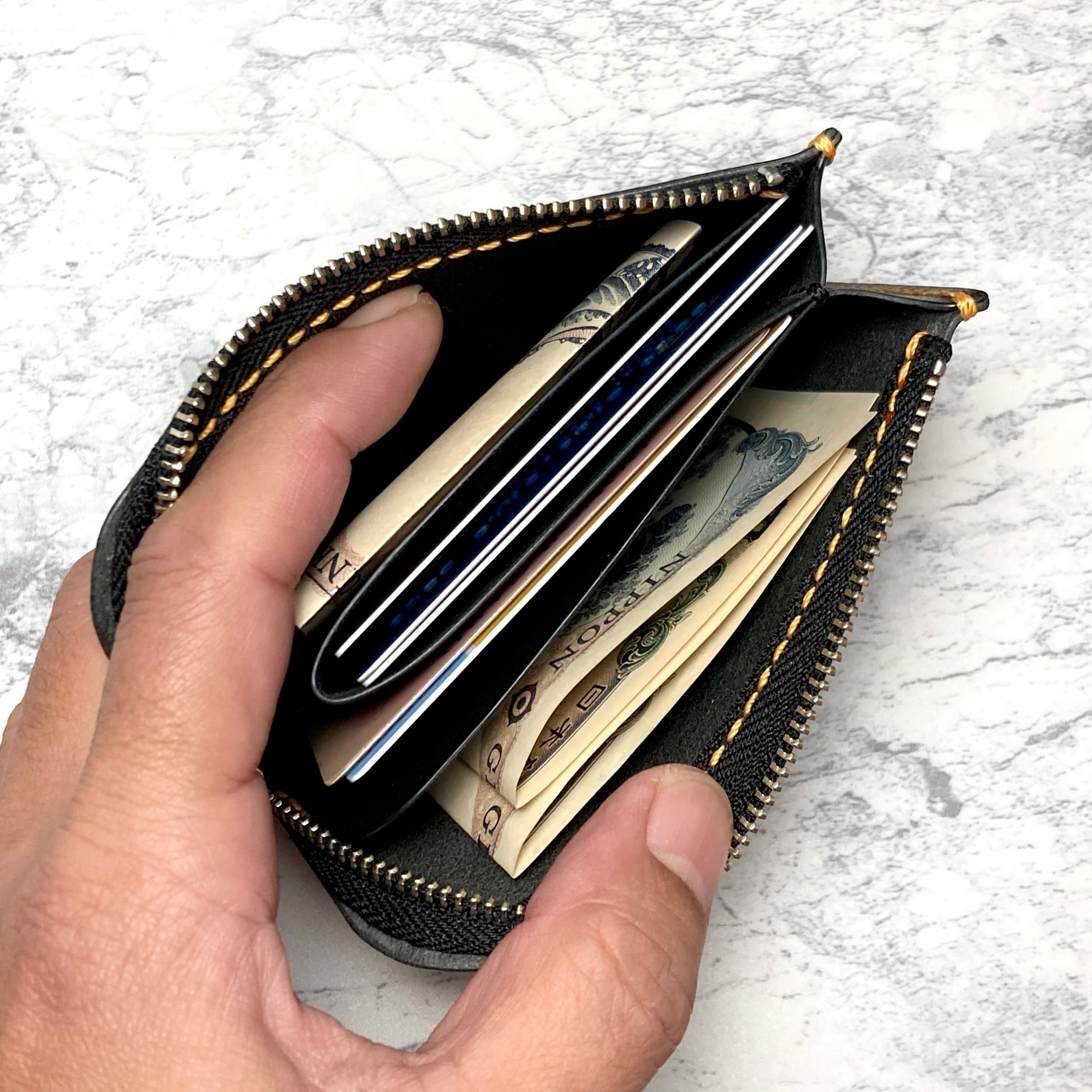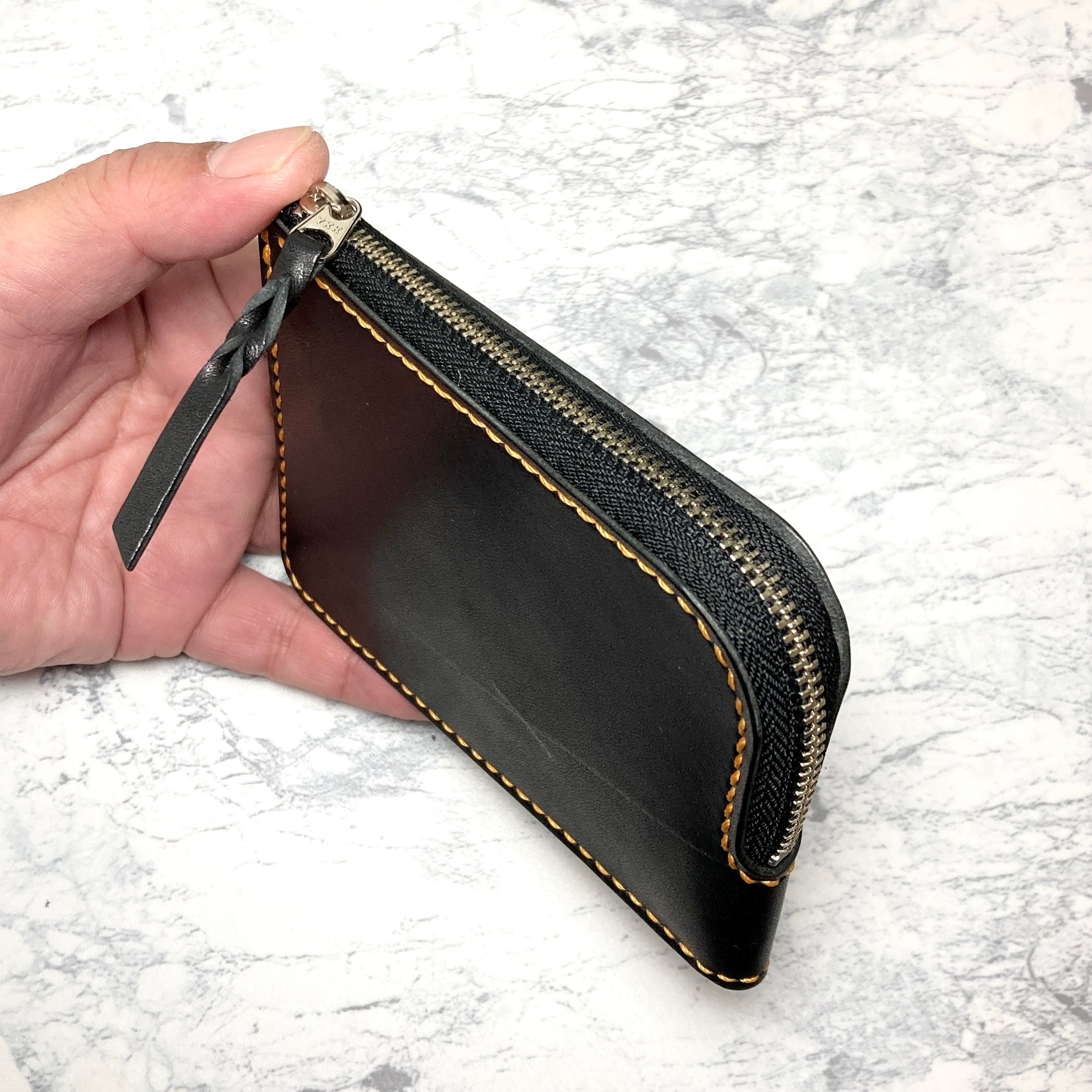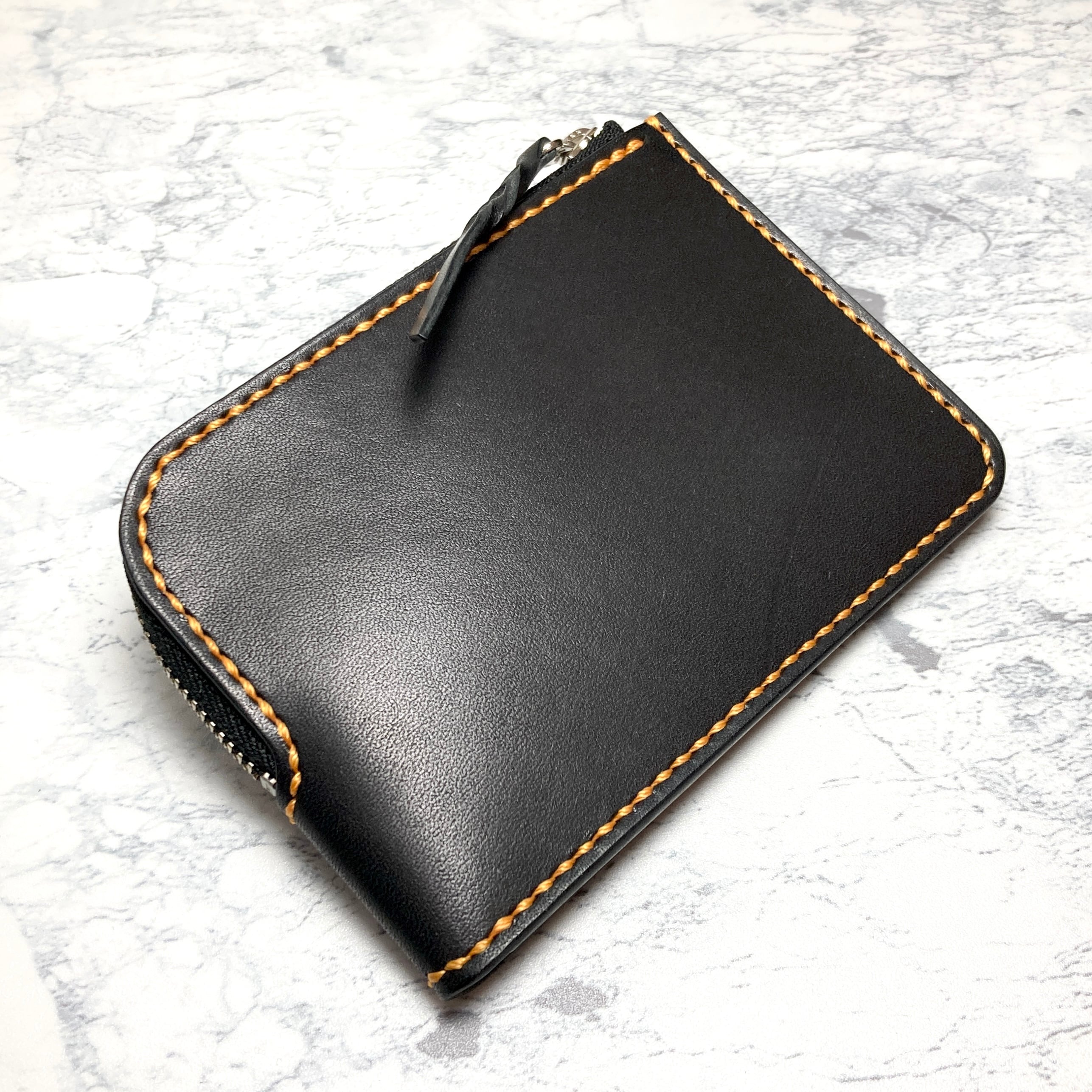 シックな黒の栃木レザーに、パッと目を引くオレンジのステッチ。 栃木レザー社製サドルレザーを使用し、一針一針を総手縫いで丁寧に仕立てたL字ファスナー財布です。