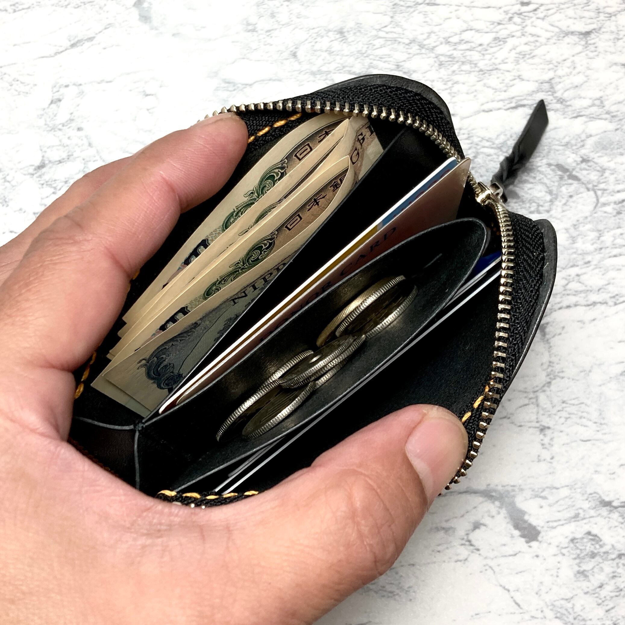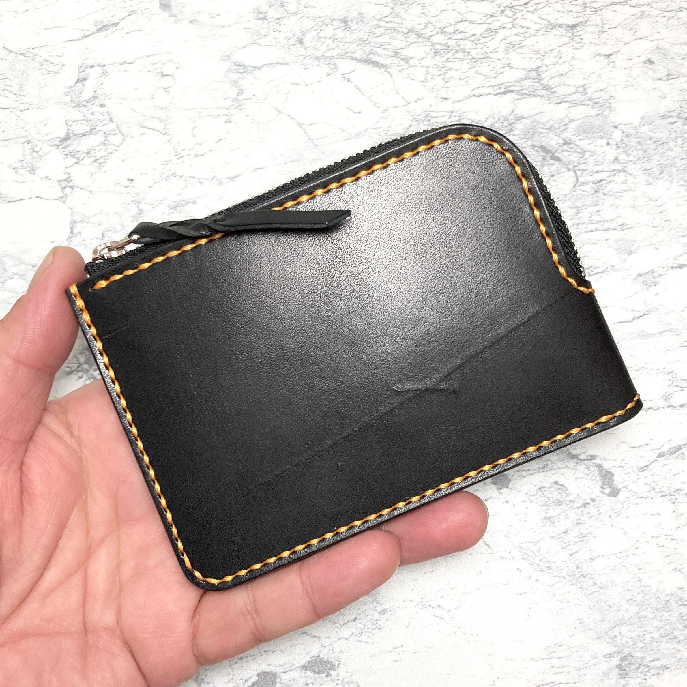 栃木レザー L字ファスナー財布 総手縫い 本革 ミニ財布 オレンジステッチ コンパクトウォレット 黒 メンズ レディース フラグメントケース