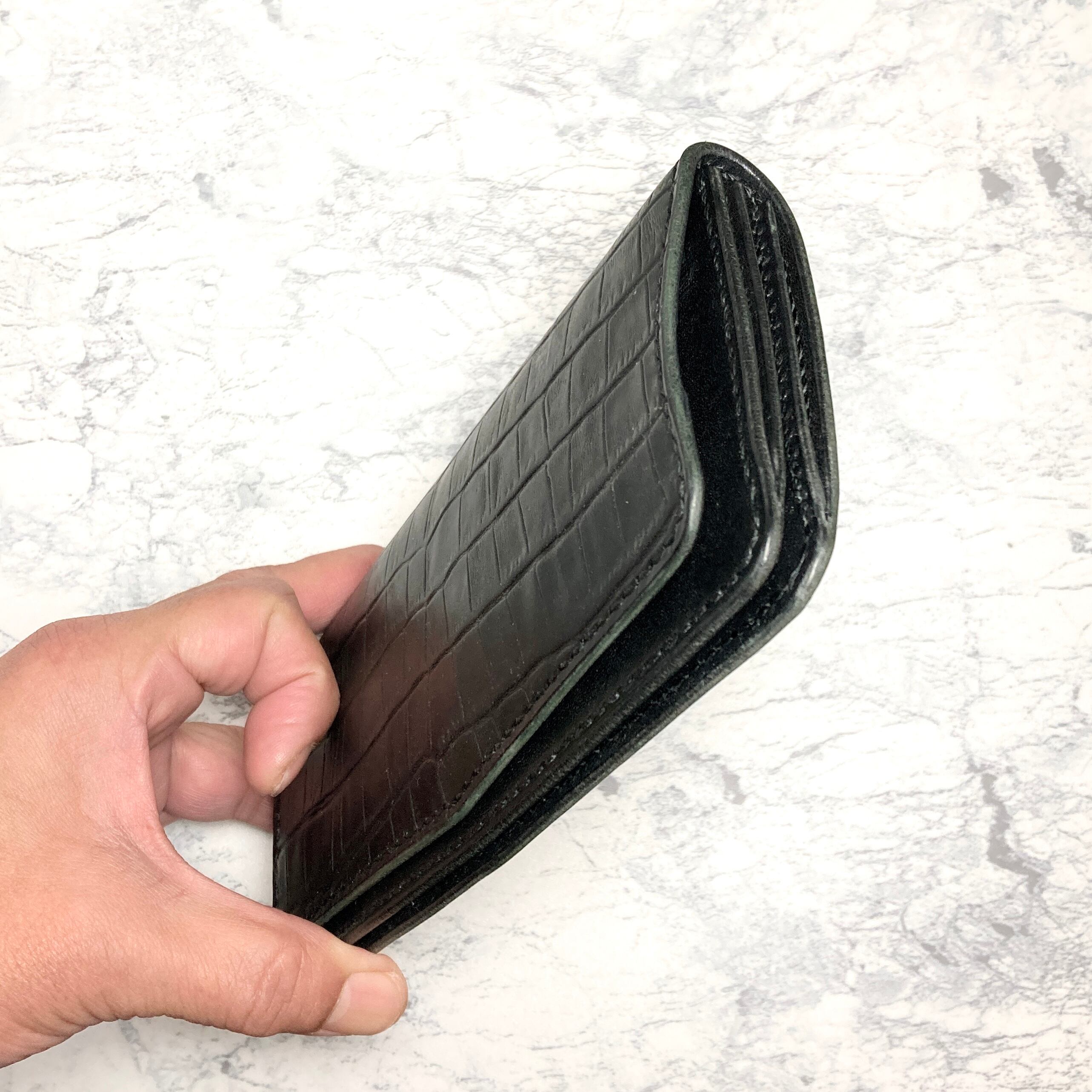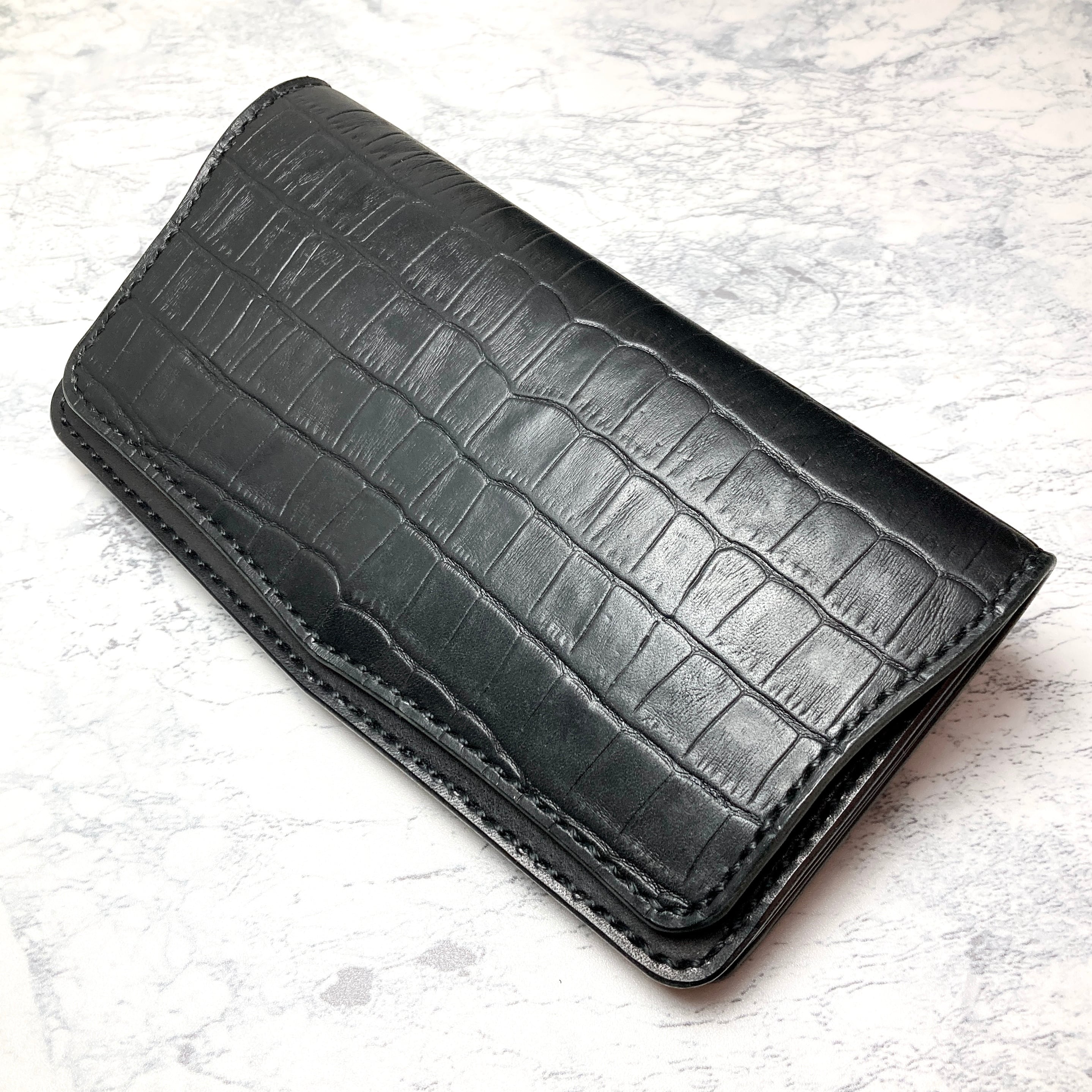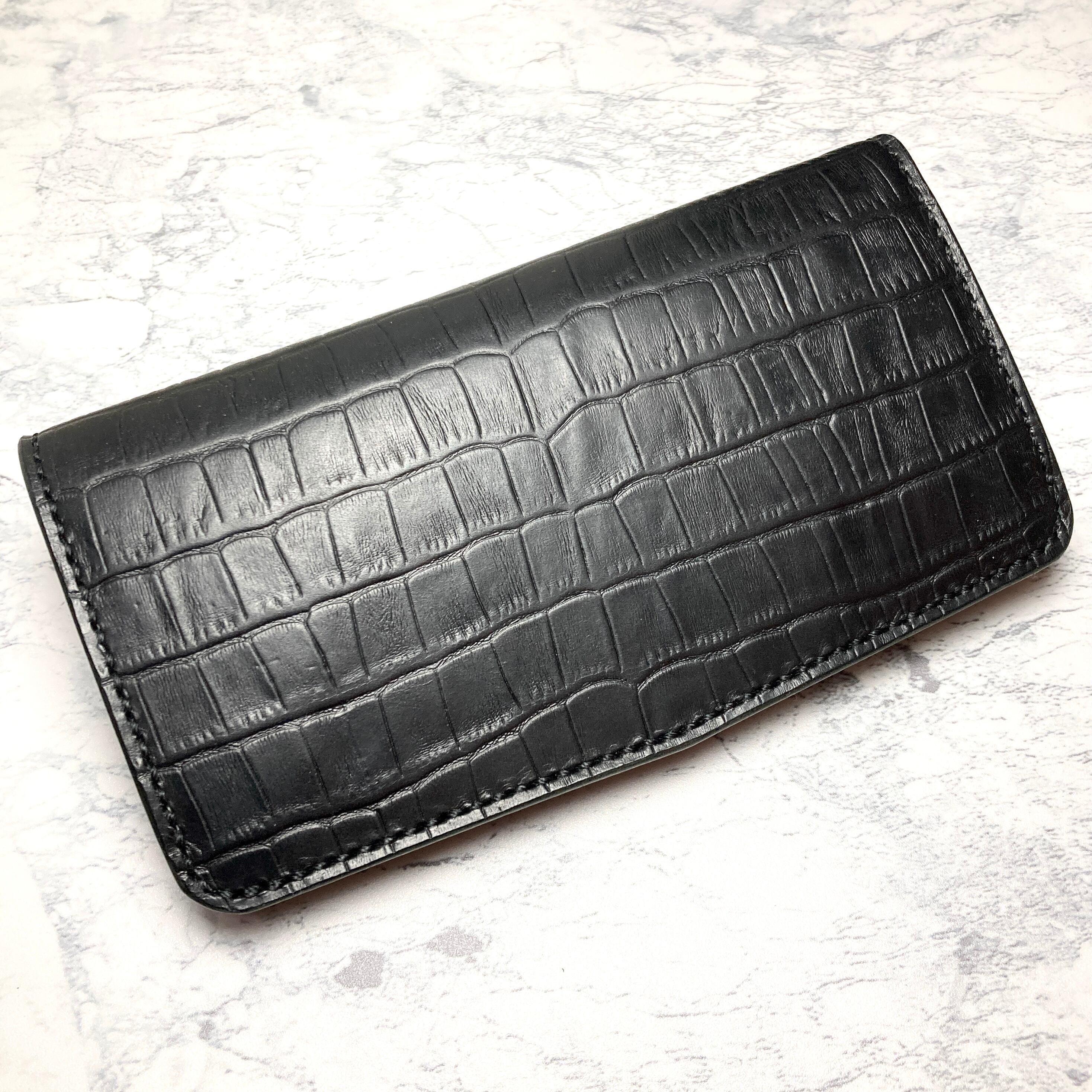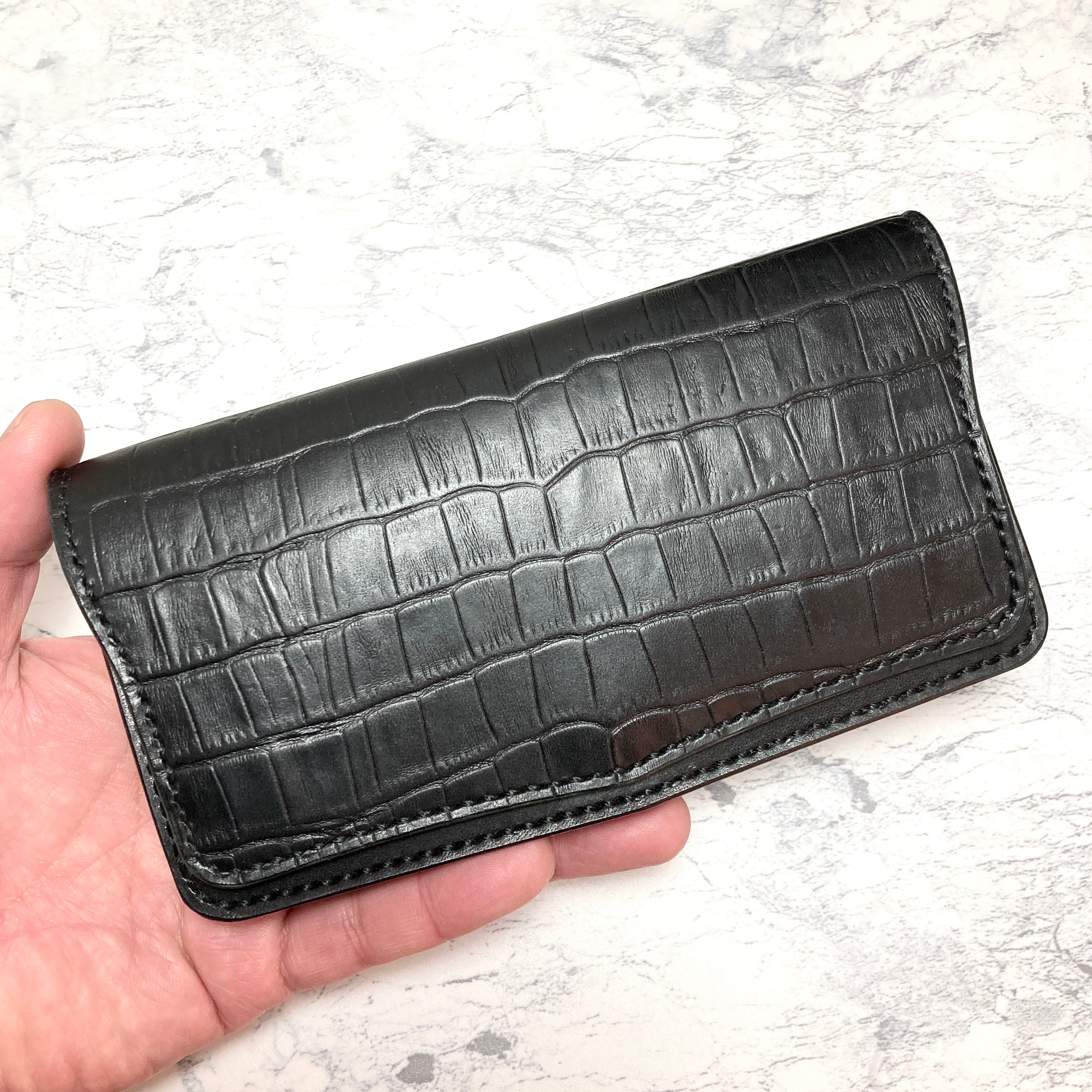 【傷に強く、品格を保つ】栃木レザー×クロコ型押しのギャルソン長財布|総手縫い 本革 ロングウォレット 黒 メンズ レディース