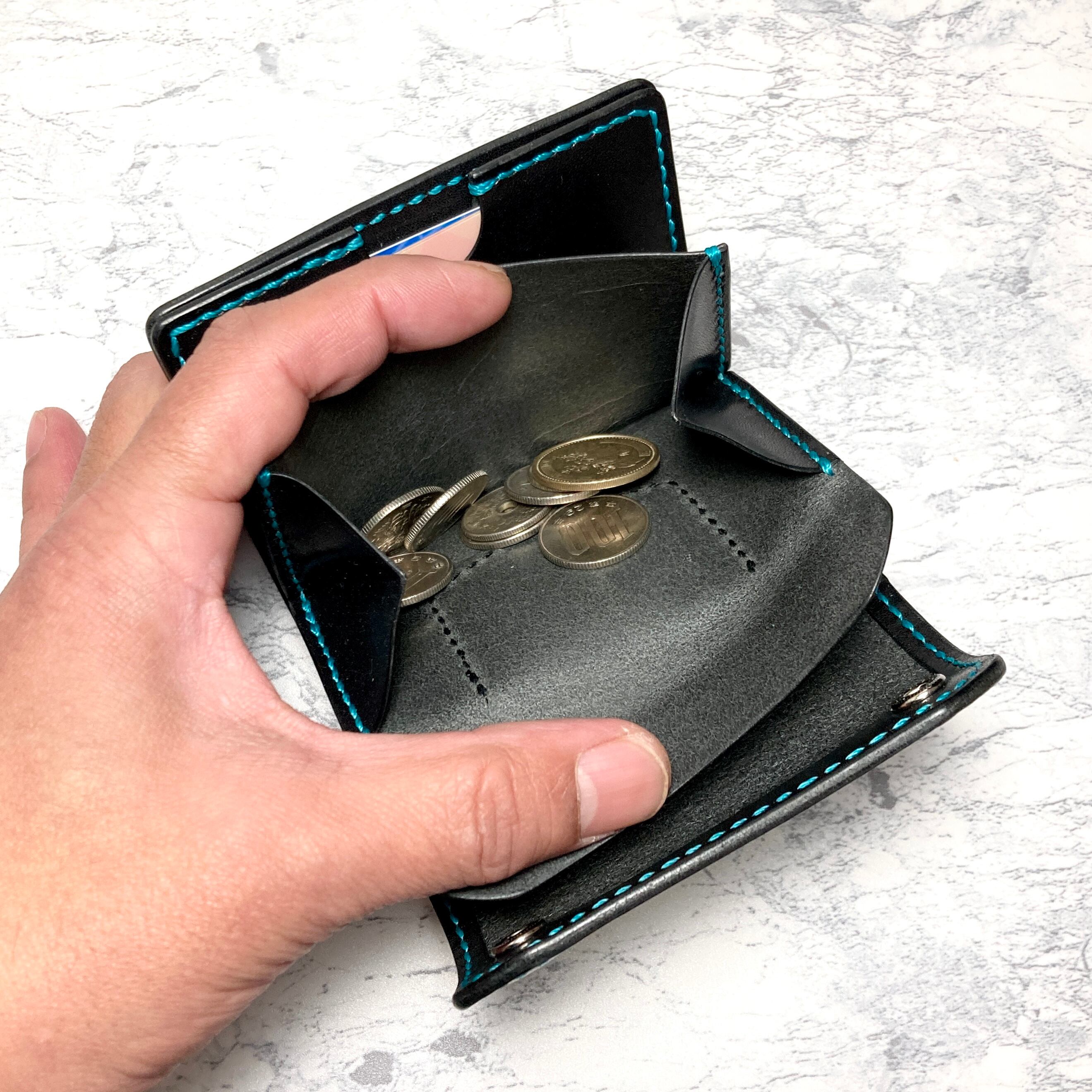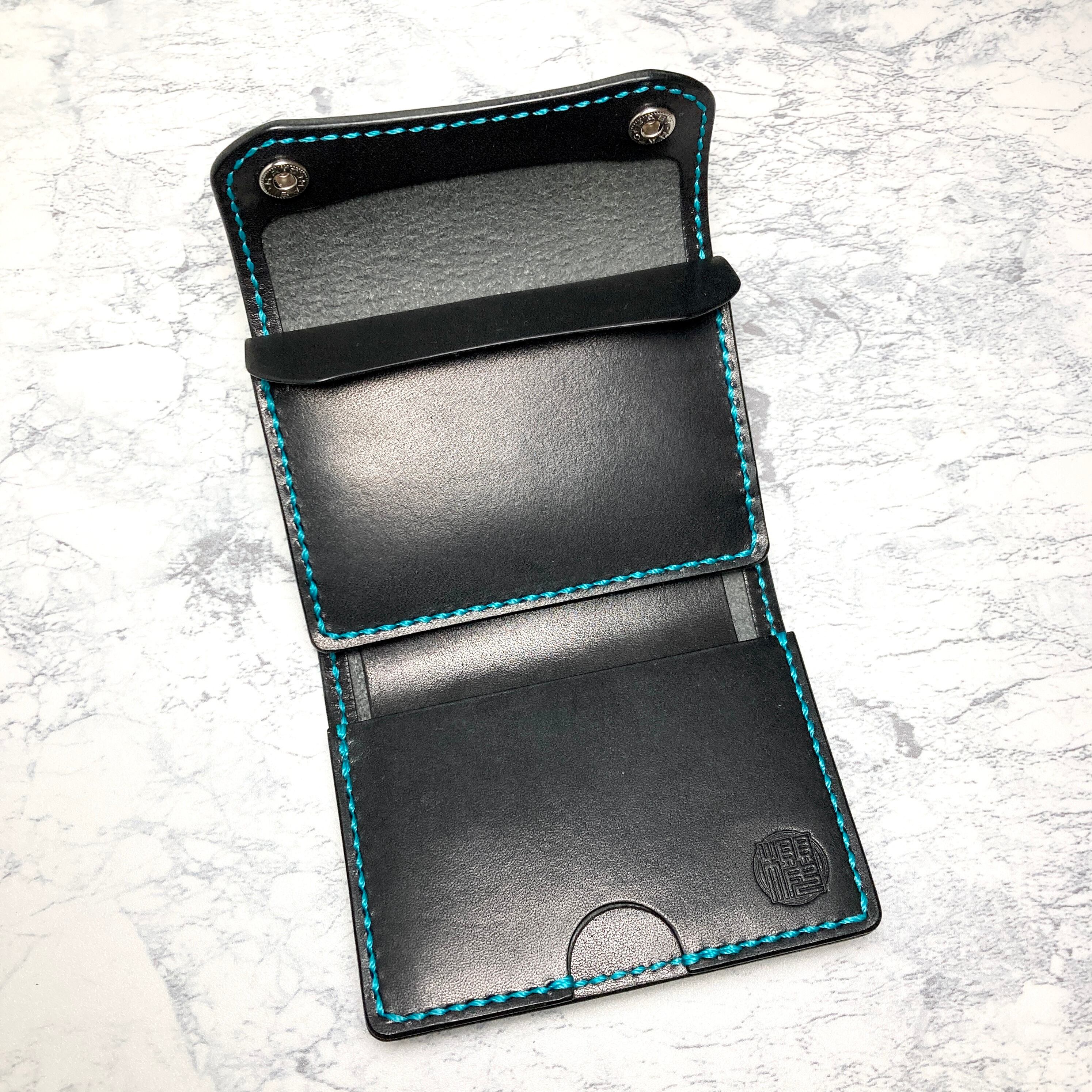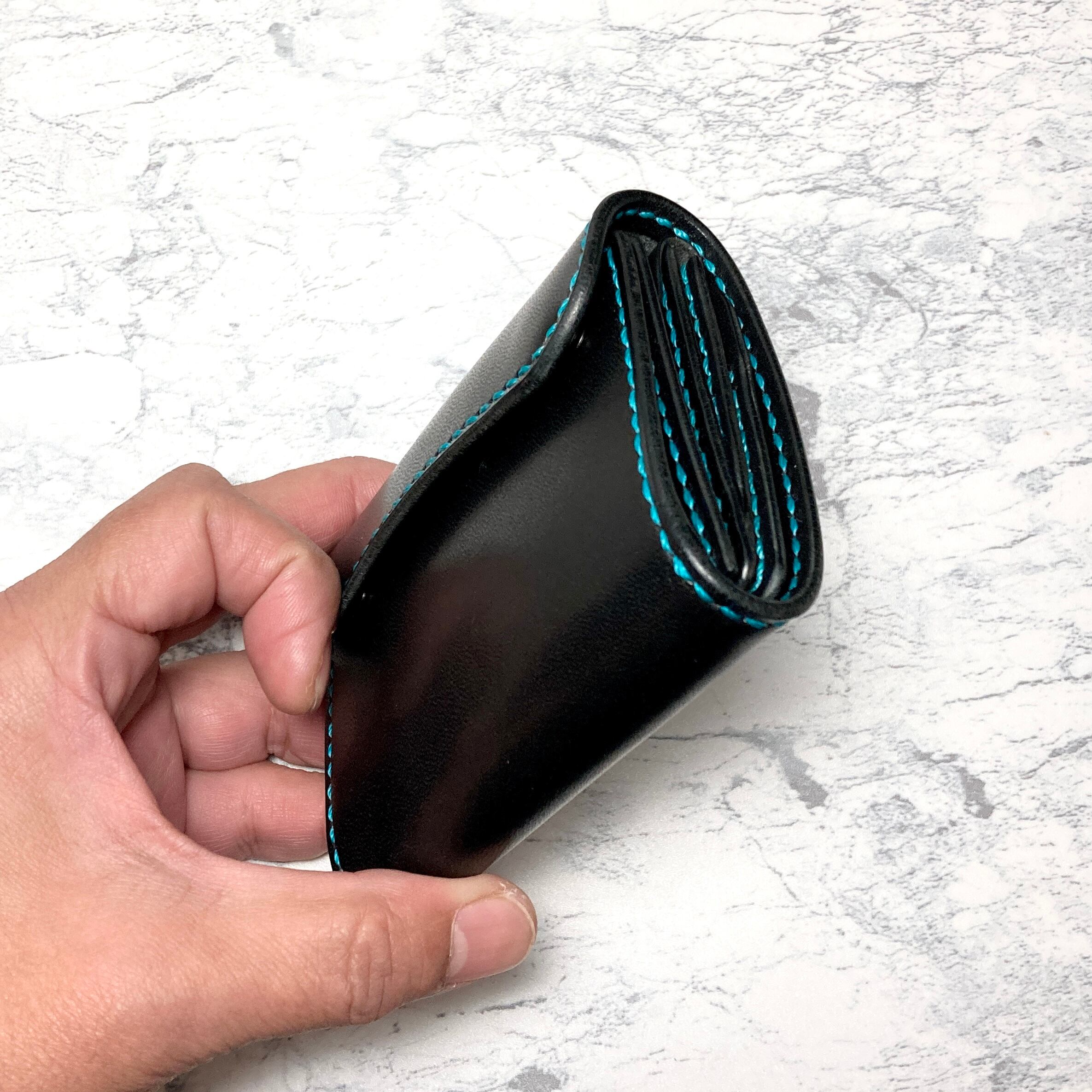 そんなこだわりを持つ方のための、重厚なブラックサドルレザーに鮮やかなターコイズブルーのステッチを効かせた、遊び心あふれる本革三つ折りミニウォレットです。
