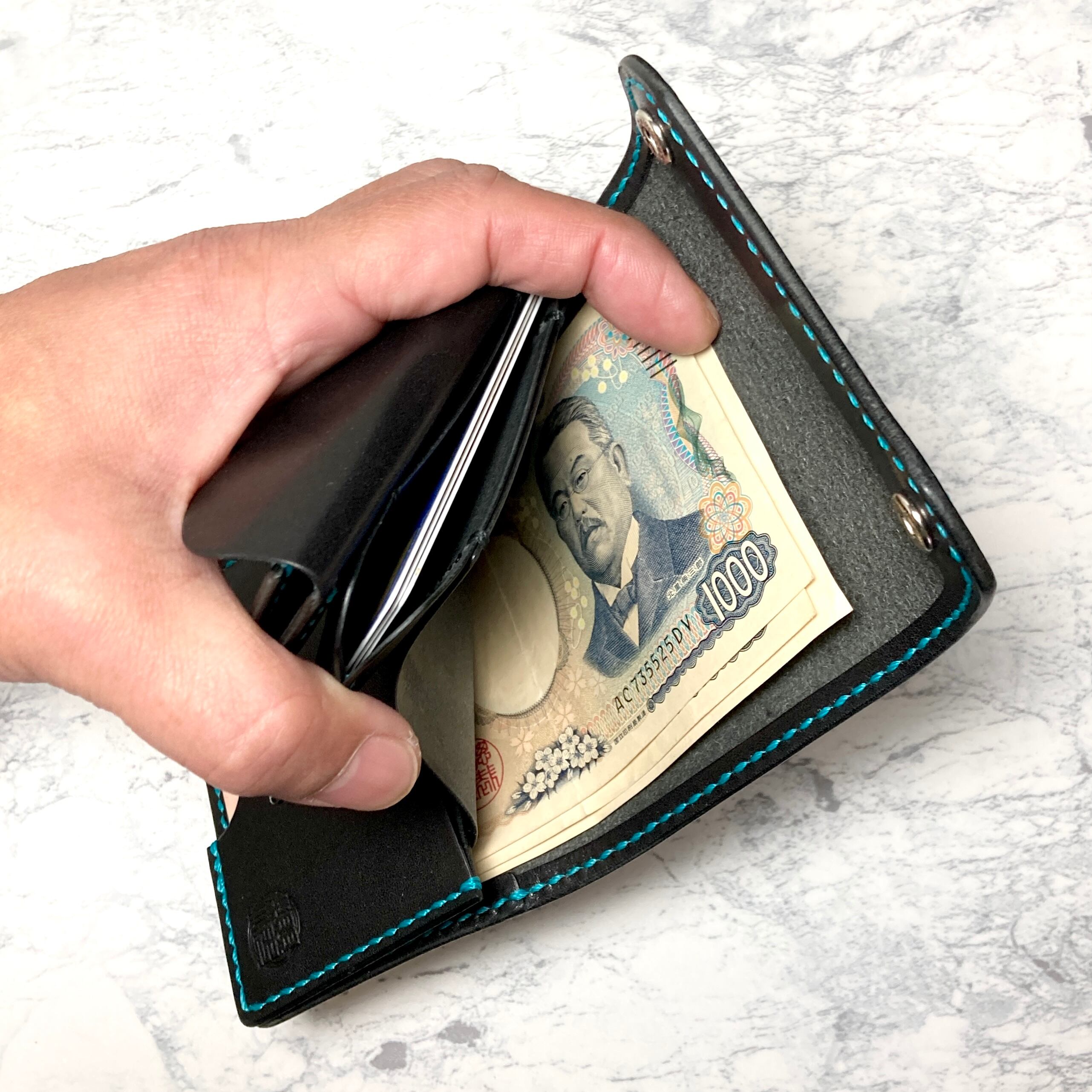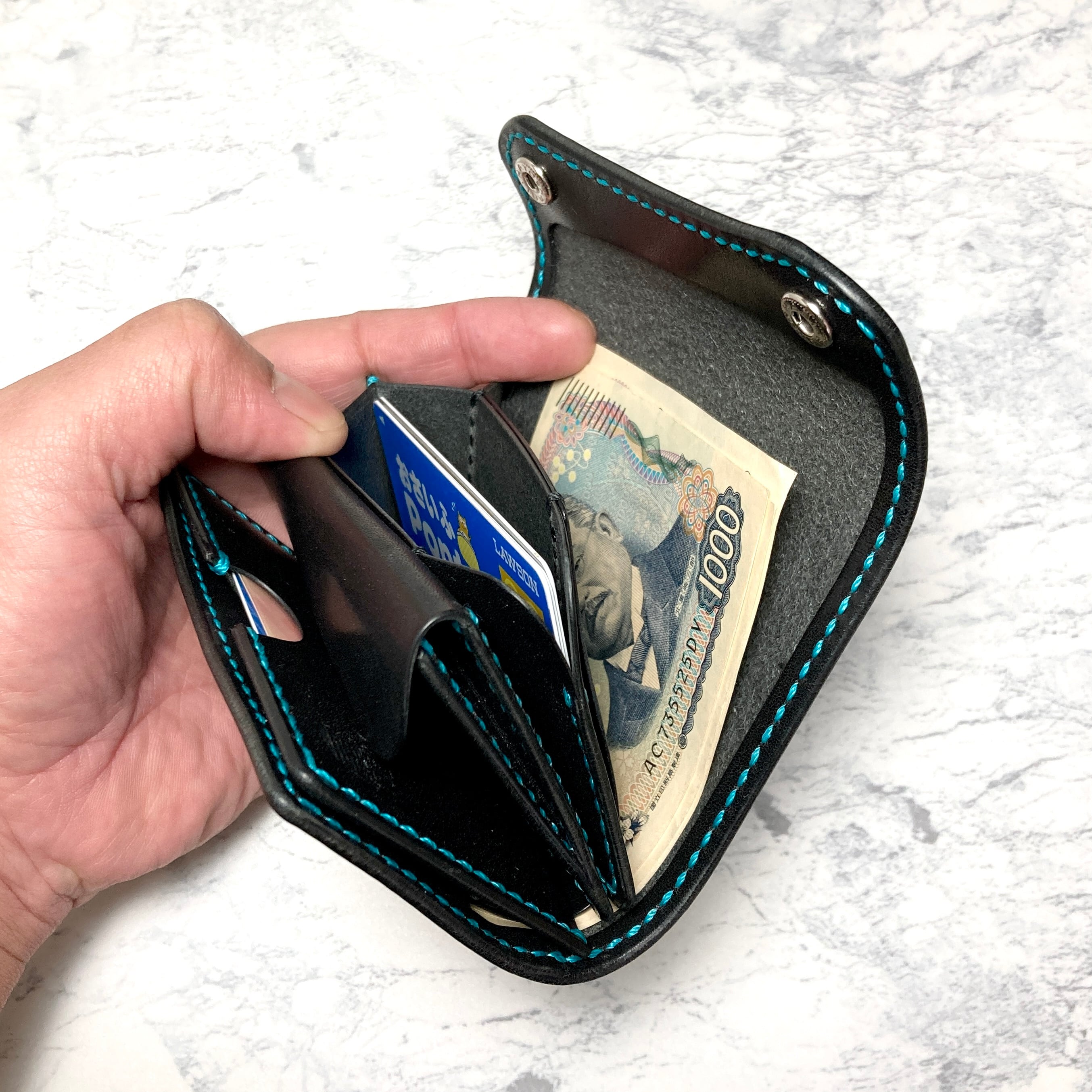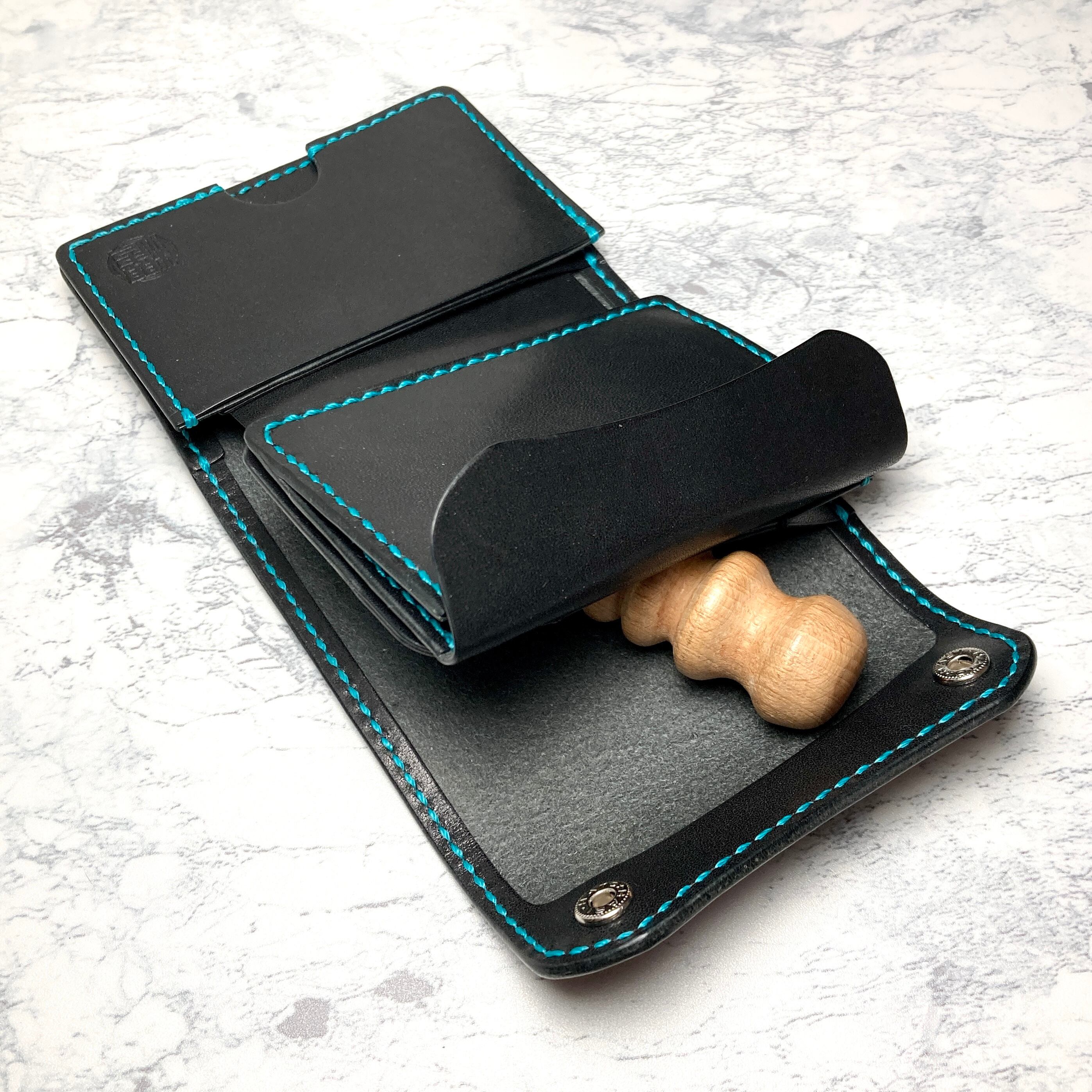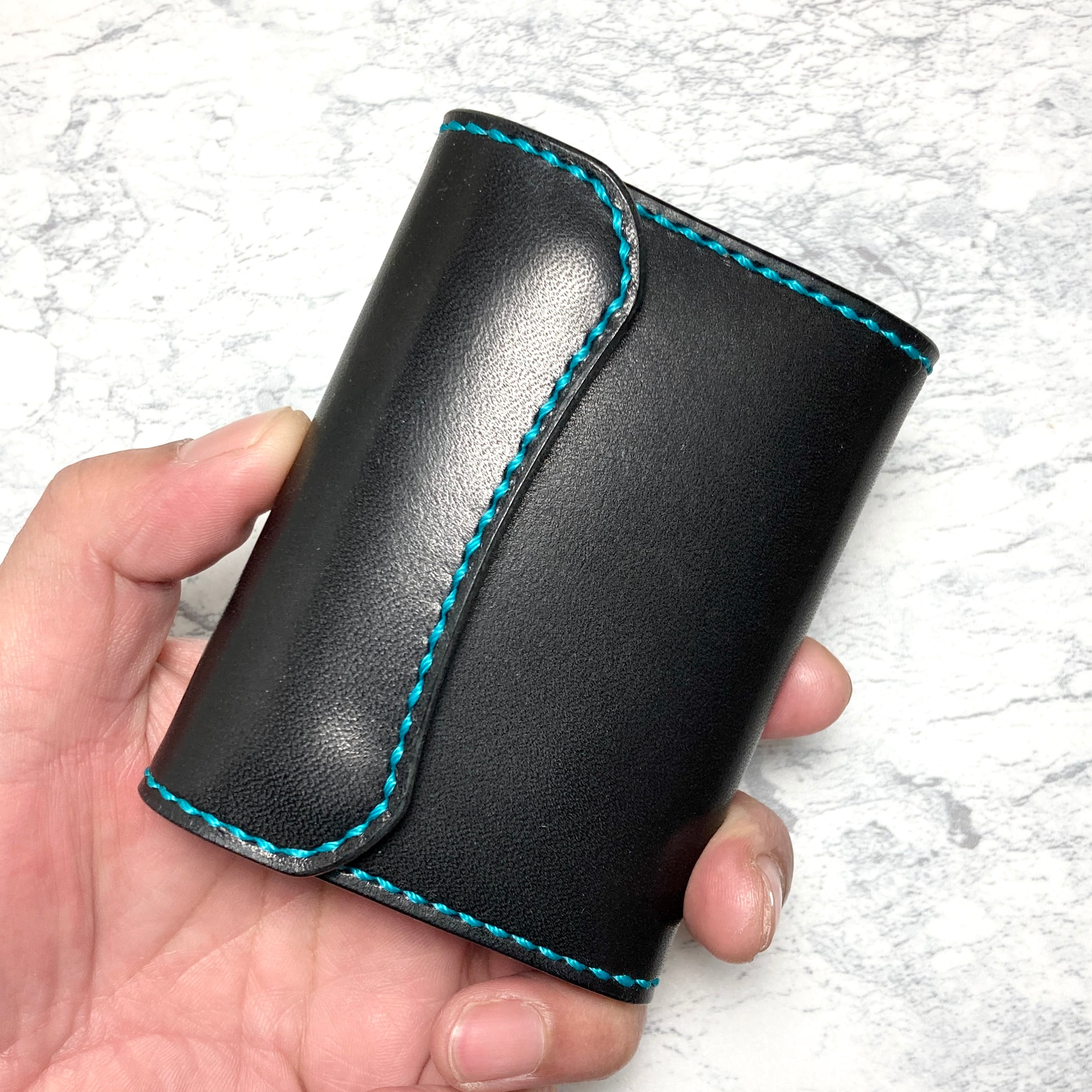 そんなこだわりを持つ方のための、重厚なブラックサドルレザーに鮮やかなターコイズブルーのステッチを効かせた、遊び心あふれる本革三つ折りミニウォレットです。
